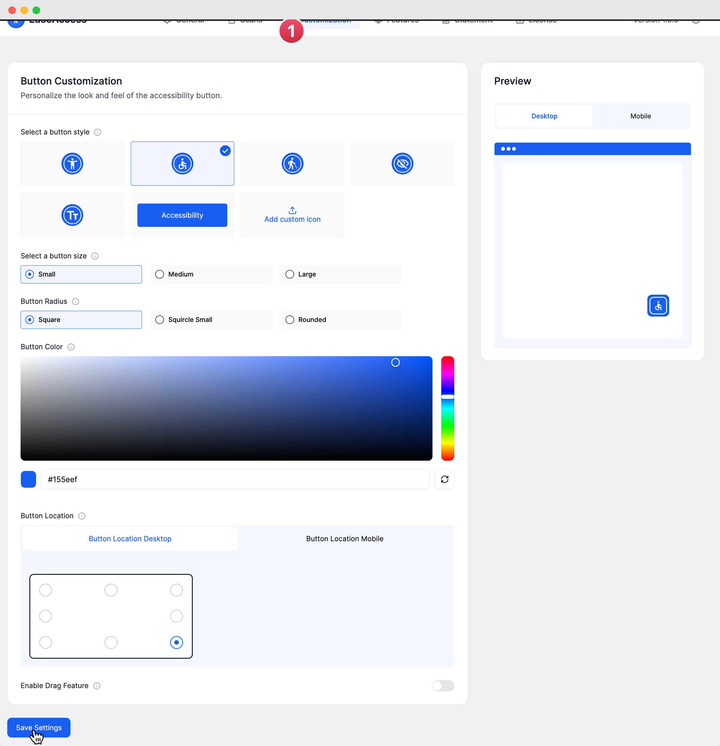 The Customization tab is your design studio for the EaseAccess accessibility button. Here, you can personalize every visual aspect of the button, from its icon and color to its precise location on the screen, ensuring it perfectly integrates with your website's branding. As you make changes, the Preview pane on the right will update in real-time.