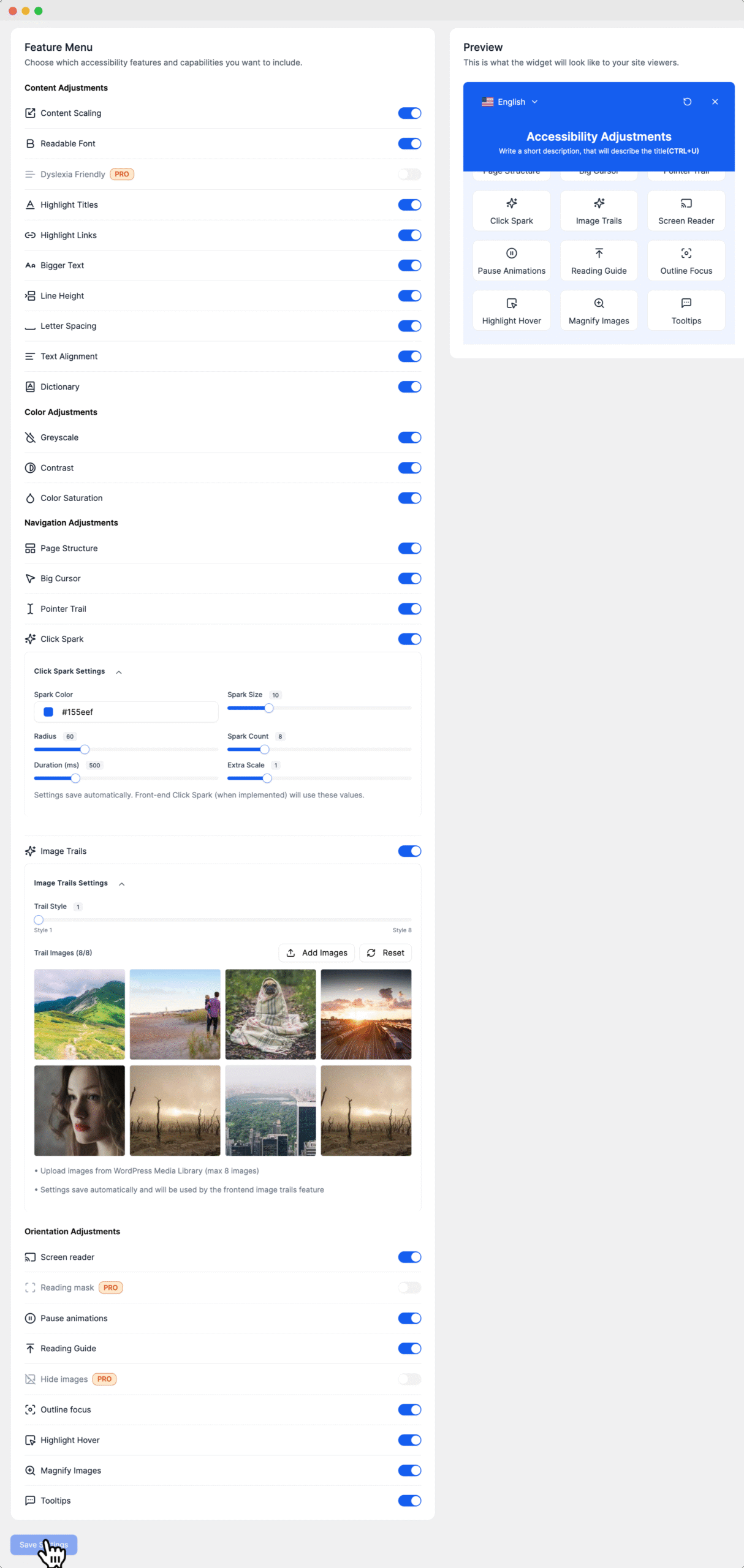 Click Spark: Creates a visual 'spark' or burst effect when the user clicks their mouse. You can customize the Spark Color, Size, Radius, Count, and Duration of the effect.