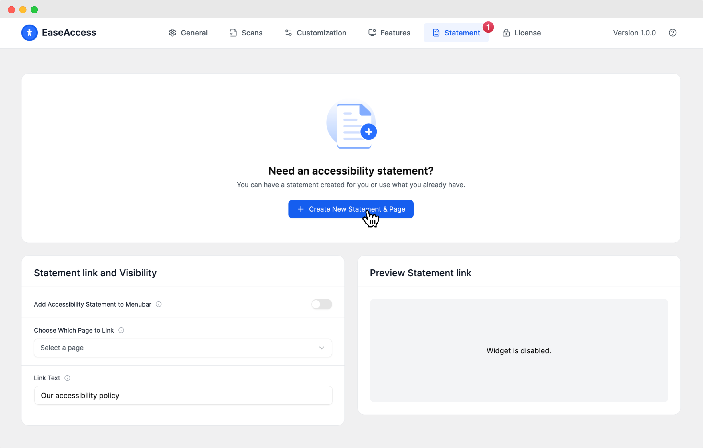 | Create New Statement & Page | Click this button to launch the guided statement creation process. This typically involves answering questions about your website's current accessibility status, conformance level (e.g., WCAG 2.1 AA), and outlining any known issues or exclusions. If you already have a statement, you can also use this tool to import it. |