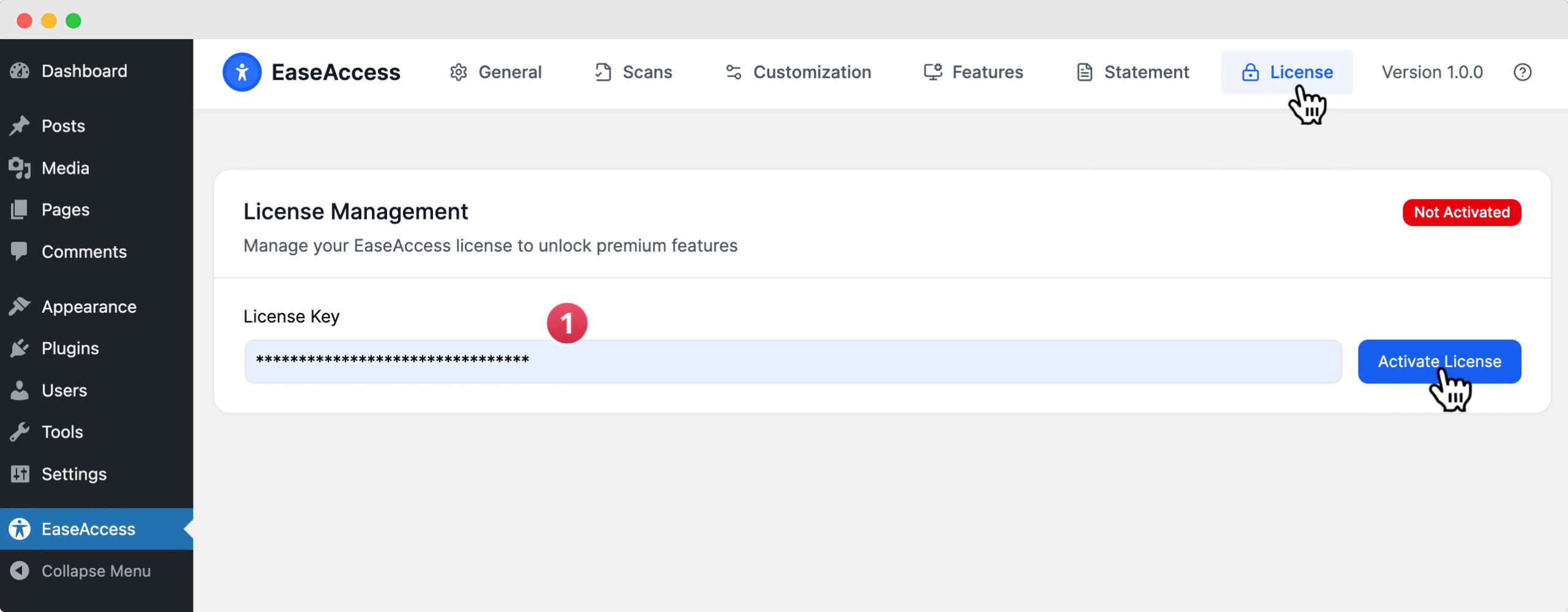Before getting started, you must activate your EaseAccess License Key. You can do this directly by navigating to EaseAccess → License in the tab menu.