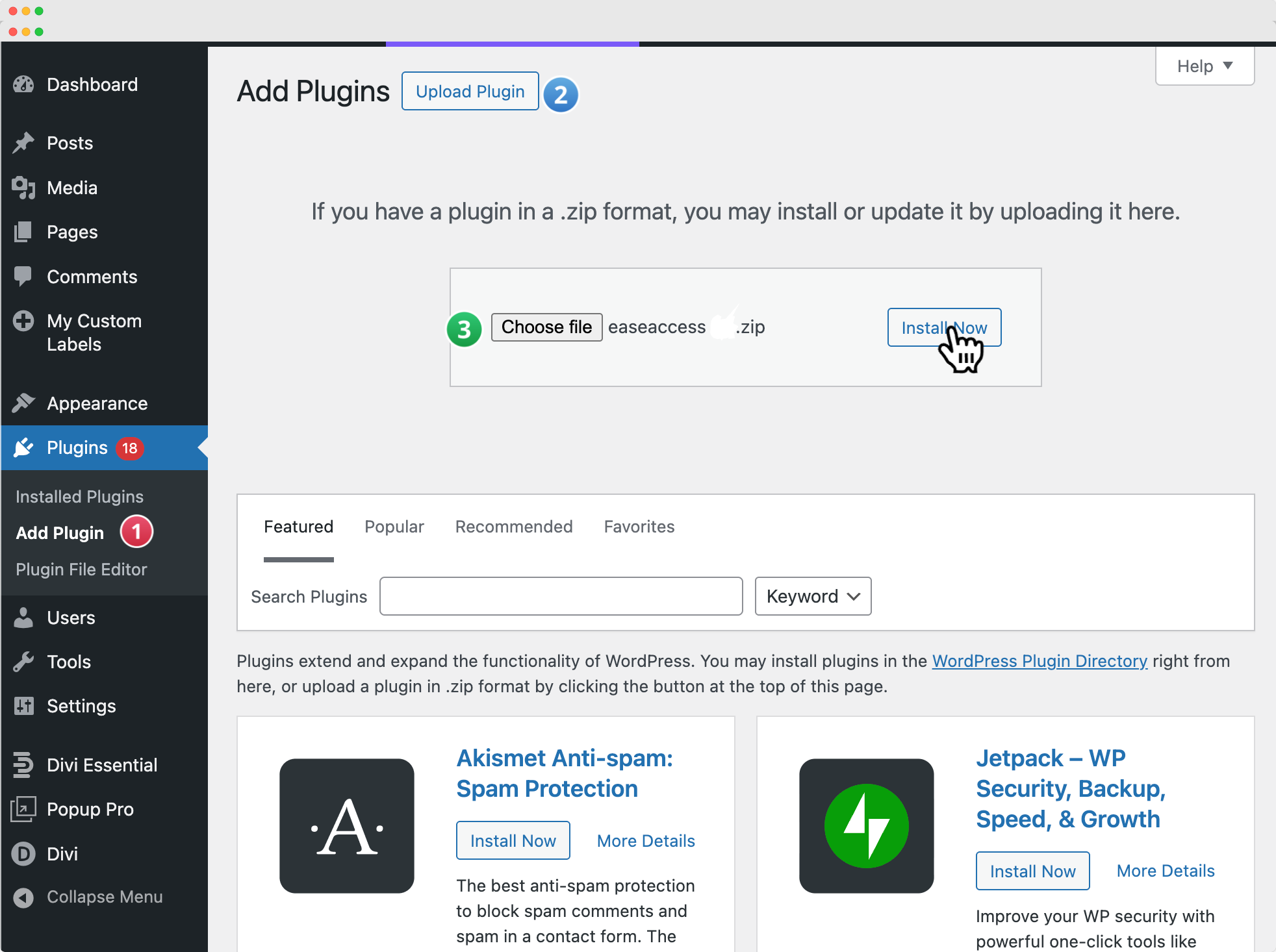 - Select and upload the EaseAccess plugin .zip file from your computer.