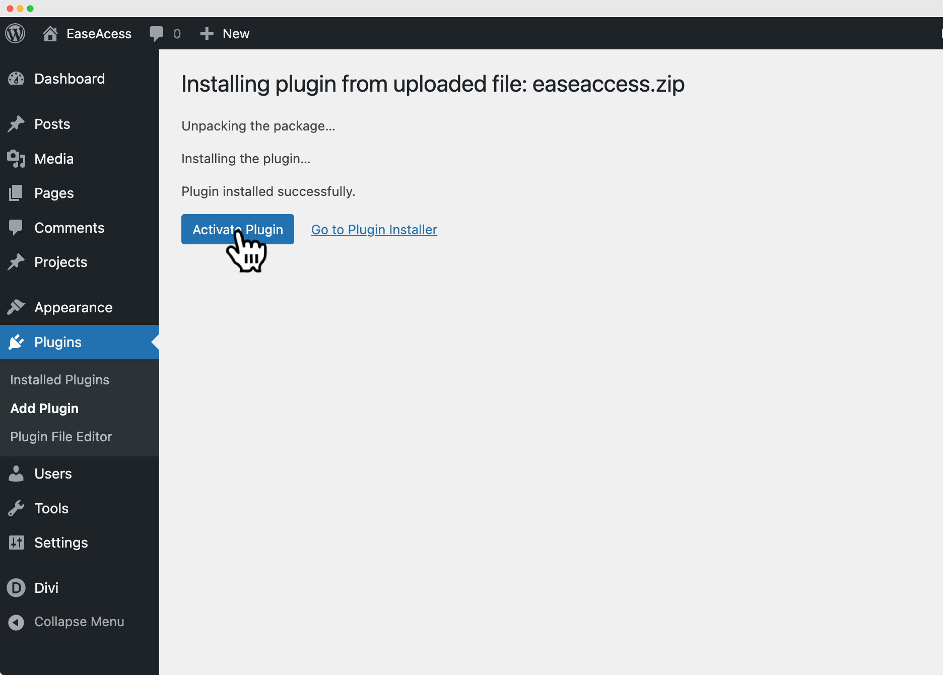 Installing the EaseAccess plugin follows the standard WordPress plugin installation process.